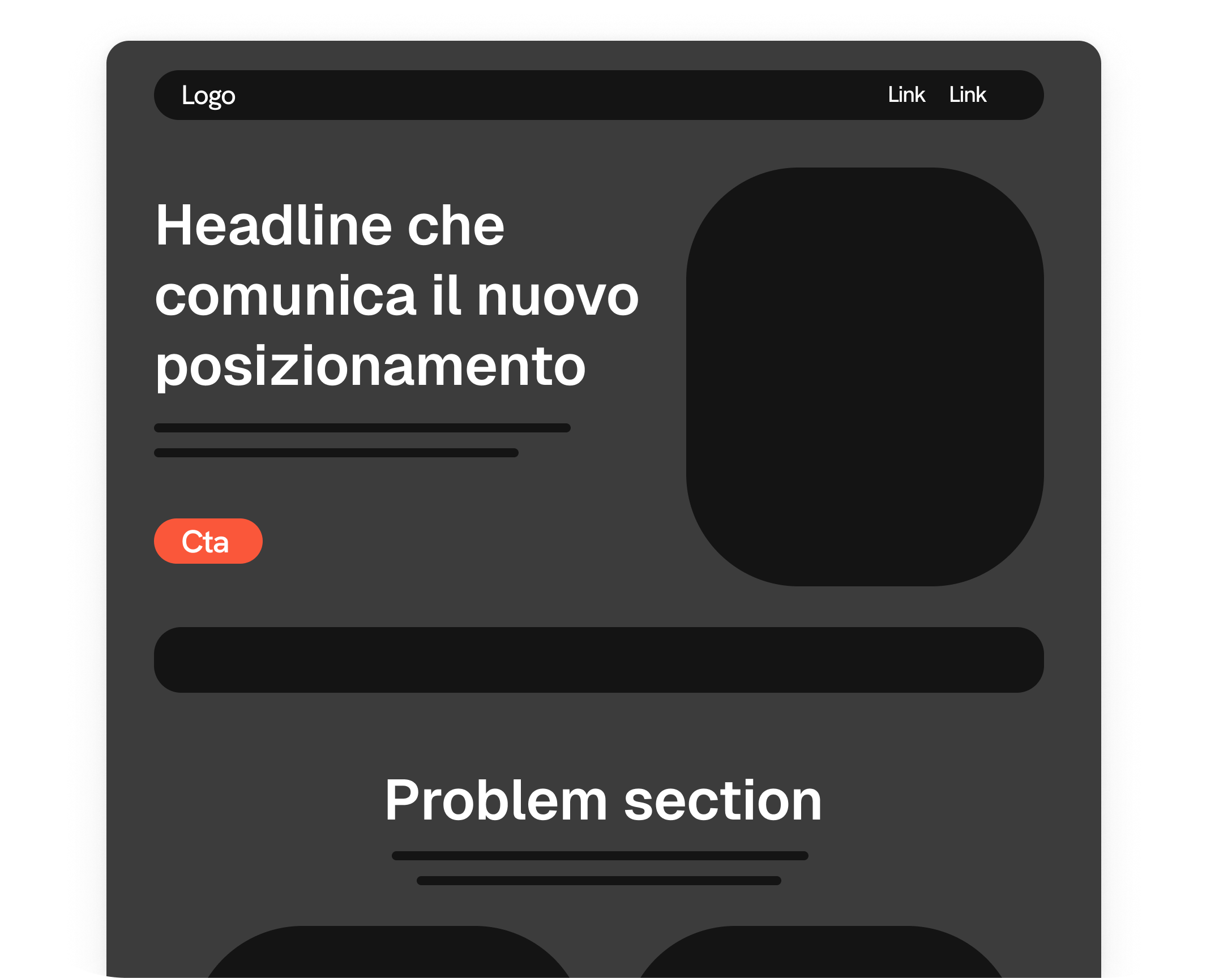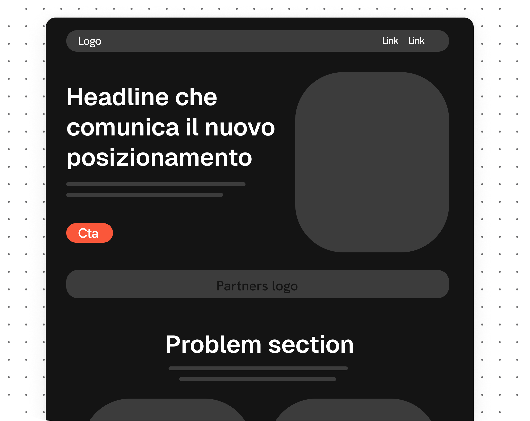Sviluppo il wireframe dell’homepage e il deck di posizionamento che saranno il riferimento per comunicare internamente e sul mercato il tuo posizionamento.